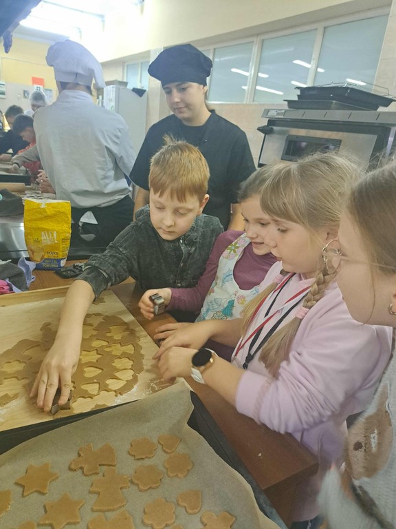 Dzisiaj uczniowie klasy trzeciej ze Szkoły Podstawowej Nr 3 w Jędrzejowie wraz z wychowawczynią przybyli do naszej szkoły na wyjątkowe warsztaty pierniczkowe. W szkolnej pracowni gastronomicznej czekały na nich przygotowane stanowiska a na nich wałki, foremki, miseczki z lukrem i kolorowymi posypkami. Dzieci wałkowały ciasto, wycinały świąteczne kształty – gwiazdki, serduszka, choinki, a nawet małe bałwanki i układały je na blachach. Kiedy pierniczki się piekły, dzieci miały chwilę na rozmowę ze starszymi uczniami kierunku technik żywienia i usług gastronomicznych, którzy opowiadali o swoich zajęciach i pasji do gotowania. To była świetna okazja, aby zaproszeni goście mogli zobaczyć profesjonalną kuchnię „od środka”.