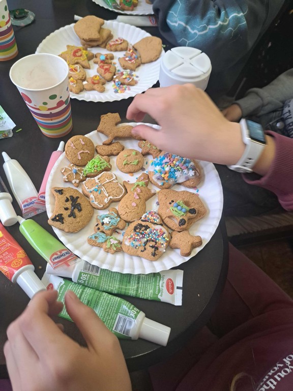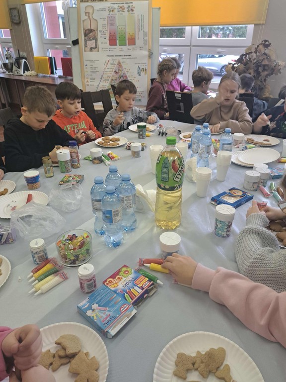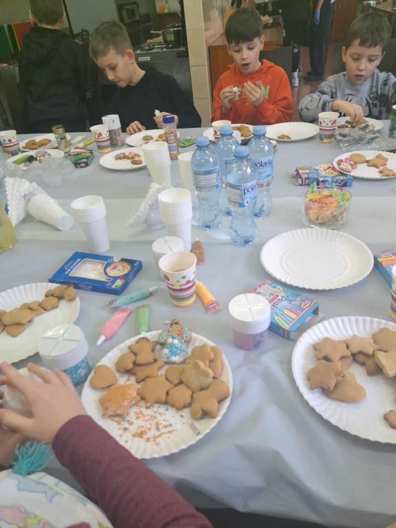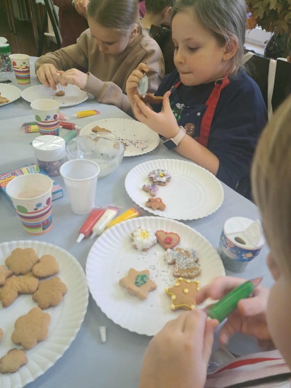 Po upieczeniu ciastek nadszedł najbardziej wyczekiwany moment – dekorowanie. Każdy uczestnik warsztatów mógł puścić wodze fantazji: malować lukrem wzorki, dodawać kolorowe cukierki, orzeszki czy czekoladowe krople. Na koniec odbyła się mała degustacja, a resztę pierniczków dzieci spakowały do torebek, by zabrać je do domu.