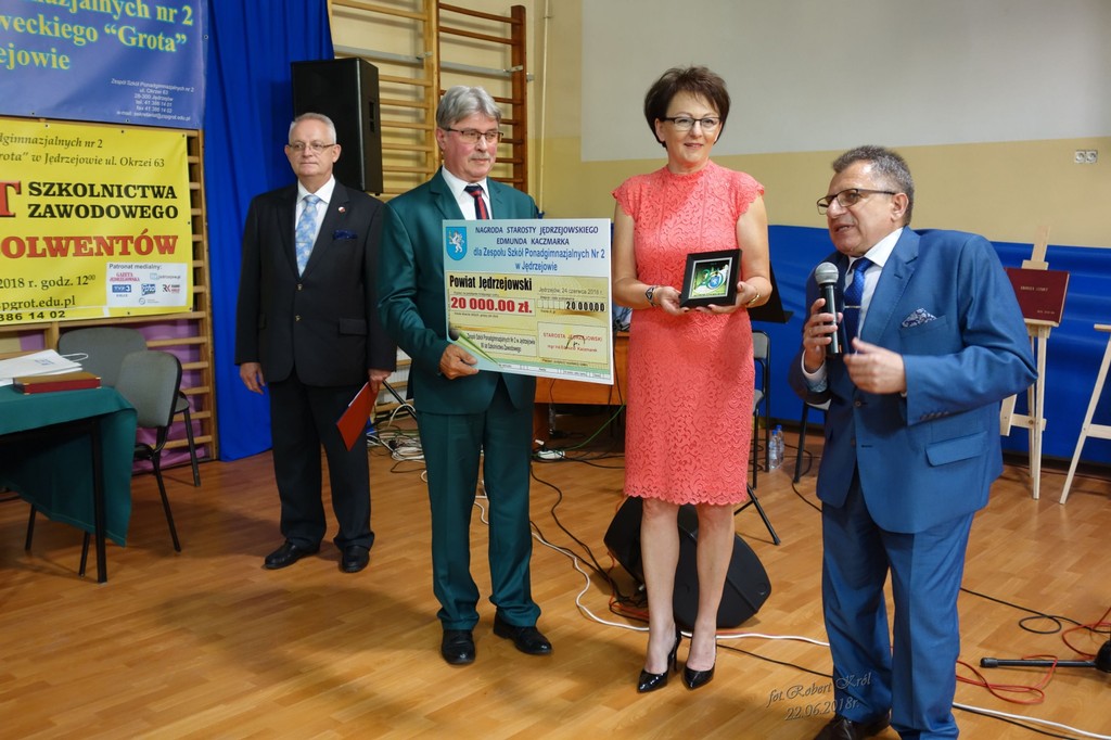 Uroczytość pożegnania uczniów klas maturalnych rozpoczęła dyrektor Zespołu Szkół Ponadgimnazjlanych Nr 2 im.S.Roweckiego “Grota” w Jędrzejowie- Jolanta Jędrzejewska. Swoje słowa skierowała do uczniów klas czwartych, które w tym dniu opuszczały mury szkoły po czterach latach nauki. Pani dyrektor życzyła absolwentom, aby ich wybory życiowe były słuszne, aby dobrze pokierowali swoim losem, bo teraz wszystko w ich rękach. Wśród przyjaciół szkoły znaleźli się w tym dniu: dr inż. Rafał Chatys z Politechniki Świętokrzyskiej, Bogusława Wypych - prezes Stowarzyszenia Ziemia Jędrzejowska “Gryf” oraz Paweł Olszak reprezentujący zarząd powiatu jędrzejowskiego. Każdy z zaproszonych gości życzył uczniom kończącym w tym dniu szkołę powodzenia w dalszym życiu, sukcesów zarówno w życiu osobistym jak i zawodowym. W imieniu wychowawców klas maturalnych pożegnała uczniów nauczyciel Renata Karp, słowami: “Życzymy Wam dzisiaj szerokiej drogi! Jesteśmy przekonani, że gdziekolwiek rzuci Was los, będziecie godnie reprezentować naszą szkołę. Pamiętajcie też, że jej drzwi będą dla Was zawsze otwarte. Idźcie odważnie przez życie. Nie bójcie się marzyć i spełniajcie swoje marzenia. Wytyczajcie sobie ambitne cele i realizujcie je. Nigdy nie traćcie nadziei, ani wiary we własne siły i umiejętności. Pamiętajcie, że o wartości człowieka decyduje to co ma w sercu”.