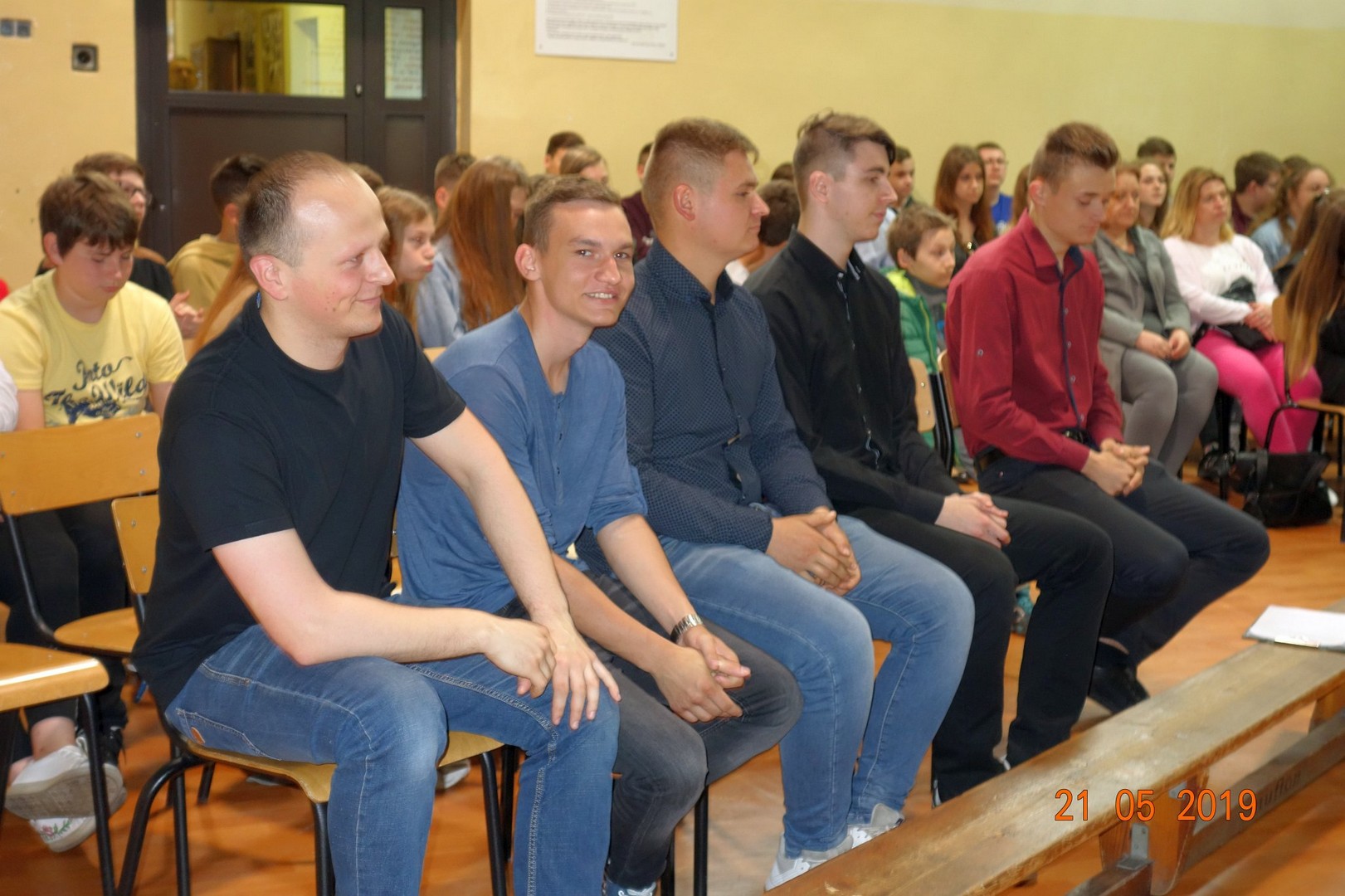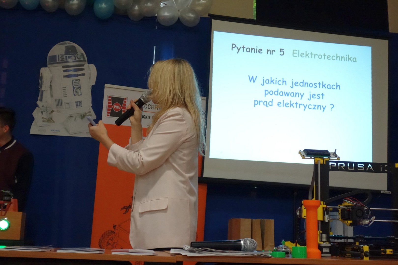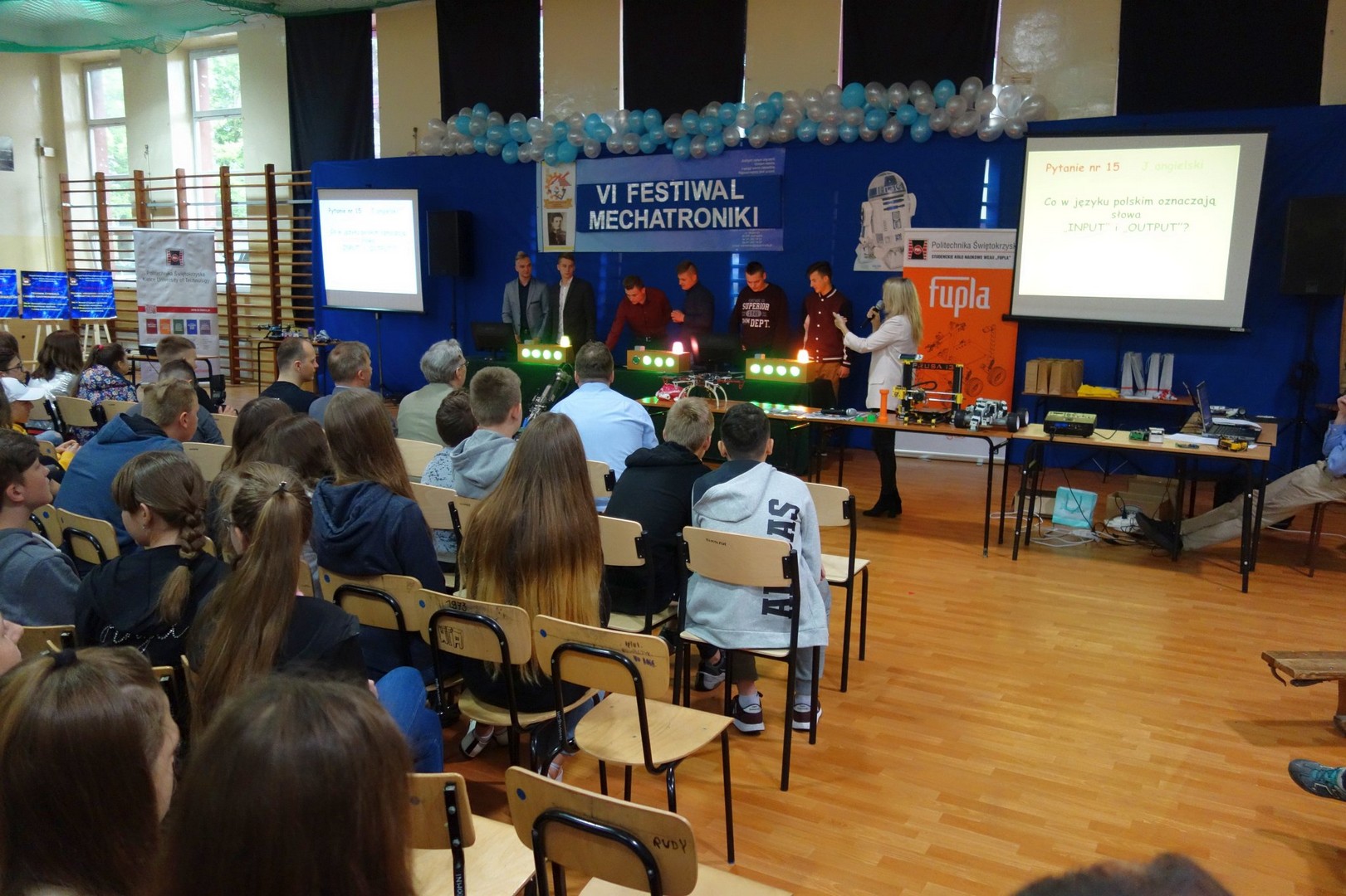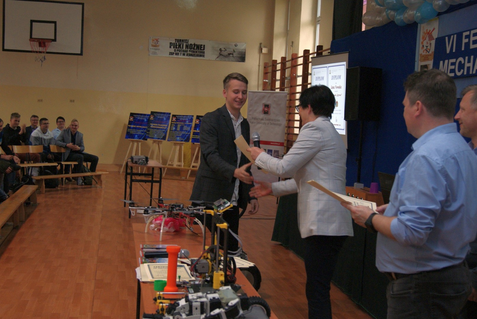 21 maja odbyła się VI edycja Festiwalu Mechatroniki, który na stałe już "zadomowił" się w kalendarzu imprez organizowanych w naszej szkole. Przedsięwzięcie to realizowane jest przy współpracy z Politechniką Świętokrzyską w Kielcach. Głównym celem imprezy jest przybliżenie młodzieży mechatroniki, jako dziedziny techniki, która w ostatnim czasie bardzo szybko się rozwija i ma coraz większy wpływ na nasze codzienne życie. W tym roku w festiwalu oprócz naszej młodzieży wzięli udział także uczniowie szkół podstawowych z Jędrzejowa, Skroniowa, Potoka Wielkiego, Rakowa oraz Łysakowa - w łącznej liczbie 197 osób. Imprezę swą obecnością uswietnili Wicestarosta Jędrzejowski - Maria Barańska, Przewodniczący Rady Powiatu Marek Mentel oraz przedstawiciele Politechniki Świętokrzyskiej w Kielcach: dr inż. Rafał Chatys, dr inż. Robert Kazała oraz mgr inż. Tomasz Piwowarczyk. Zgromadzonych na sali gimnastycznej gości powitała dyrektor szkoły Jolanta Jędrzejewska. Tuż po tym, uczeń klasy II Tmi Mateusz Miśkiewicz przedstawił krótki referat na temat istoty mechatroniki wprowadzając w ten sposób zgromadzonych na sali w tematykę festiwalu. Następnie wyświetlona została prezentacja multimedialna pt. "Technik mechatronik w ZSP nr 2 w Jędrzejowie" przedstawiająca wyposażenie szkolnych pracowni mechatronicznych oraz poczynania naszych mechatroników na zajęciach z przedmiotów zawodowych. Kolejnym punktem festiwalu było wystąpienie dr inż. Roberta Kazały z Katedry Urządzeń i Systemów Automatyki na WEAiI Politechniki Świętokrzyskiej w Kielcach. Prelegent w swej prezentacji skupił się na zagadnieniach związanych z budową, sterowaniem i zastosowaniem robotów. Zaprezentowane zostały także efekty pracy młodych mechatroników z ZSP nr 2, którzy od kilku lat na zajęciach dodatkowych budują układy związane z elektroniką i robotyką. W trakcie VI Festiwalu Mechatroniki nie brakło konkursów w których zgromadzeni na sali goście musieli wykazać się spostrzegawczością, wiedzą z zakresu mechatroniki oraz umiejętnościami praktycznymi w sterowaniu mini-robotami za pomocą "komórek" czy pilotów wifi. Swych sił próbowali uczniowie klas I, II, III uczący się w zawodzie technik mechatronik, którzy zmierzyli się w konkursie wiedzy mechatronicznej wzorowanym na telewizyjnym turnieju 1 z 10. Zwyciężyła reprezentacja klasy II, przed teamem klasy III i I. Na zakończenie VI Festiwalu Mechatroniki zostały wręczone dyplomy, podziękowania oraz drobne upominki. Najwytrwalsi mogli przyjrzeć się z bliska przywiezionym przez przedstawicieli PŚK układom robotyki, porozmawiać na ich temat, jak również przetestować "szkolne" mini-roboty, czy wykonać pamiątkowe zdjęcia.