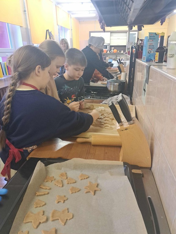 Dzisiaj uczniowie klasy trzeciej ze Szkoły Podstawowej Nr 3 w Jędrzejowie wraz z wychowawczynią przybyli do naszej szkoły na wyjątkowe warsztaty pierniczkowe. W szkolnej pracowni gastronomicznej czekały na nich przygotowane stanowiska a na nich wałki, foremki, miseczki z lukrem i kolorowymi posypkami. Dzieci wałkowały ciasto, wycinały świąteczne kształty – gwiazdki, serduszka, choinki, a nawet małe bałwanki i układały je na blachach. Kiedy pierniczki się piekły, dzieci miały chwilę na rozmowę ze starszymi uczniami kierunku technik żywienia i usług gastronomicznych, którzy opowiadali o swoich zajęciach i pasji do gotowania. To była świetna okazja, aby zaproszeni goście mogli zobaczyć profesjonalną kuchnię „od środka”.