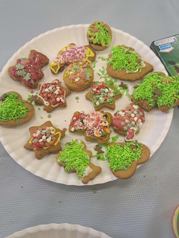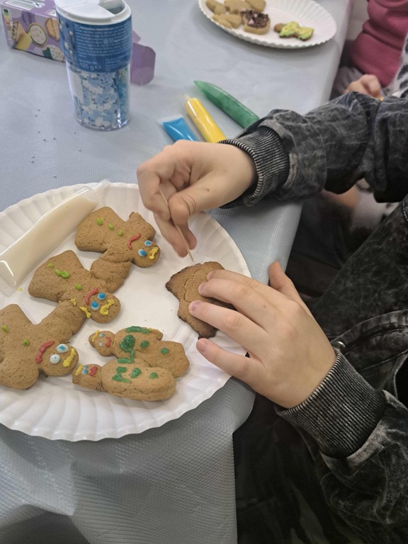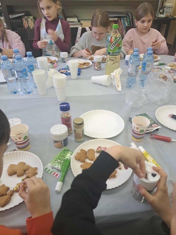 Po upieczeniu ciastek nadszedł najbardziej wyczekiwany moment – dekorowanie. Każdy uczestnik warsztatów mógł puścić wodze fantazji: malować lukrem wzorki, dodawać kolorowe cukierki, orzeszki czy czekoladowe krople. Na koniec odbyła się mała degustacja, a resztę pierniczków dzieci spakowały do torebek, by zabrać je do domu.
