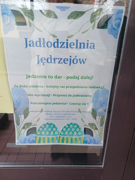 Szkolny Klub Europejski w Zespole Szkół nr 2 im.gen. Stefana Roweckiego "Grota" w Jędrzejowie, wspiera działalność "Jadłodzielni", która działa przy Ośrodku Pomocy Społecznej Miasta i Gminy Jędrzejów. Uczniowie przed świętami Wielkanocnymi chcieli dołożyć coś od siebie i zebrali podstawowe produkty spożywcze, które mogą pomoć osobom potrzebującym. Do jędrzejowskiej "Jadłodzielni" przekazaliśmy min.ryż, kaszę, makarony, żurek, barszcz biały, budyń itp. "Jadłodzielnia" jest właśnie takim miejscem, gdzie ludzie mogą pozostawić nadmiar jedzenia lub skorzystać z tego, co zostawili inni, całkowicie za darmo. Celem funkcjonowania "Jadłodzielni" jest nie tylko marnowanie żywności, ale także wspieranie tych, którzy mogą mieć problemy z zapewnieniem sobie posiłków.